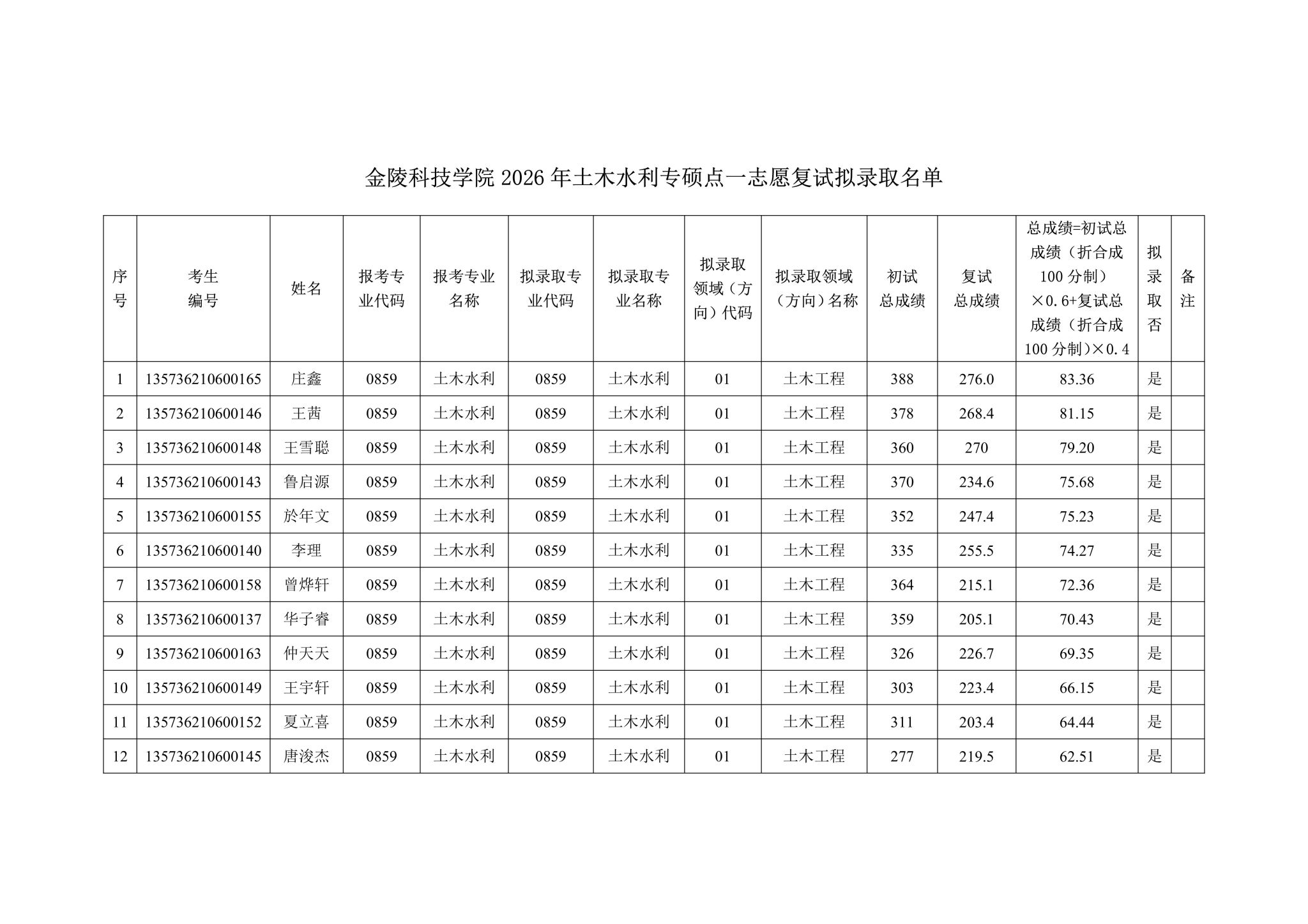 附:金陵科技学院2026年土木水利专硕点一志愿复试拟录取名单